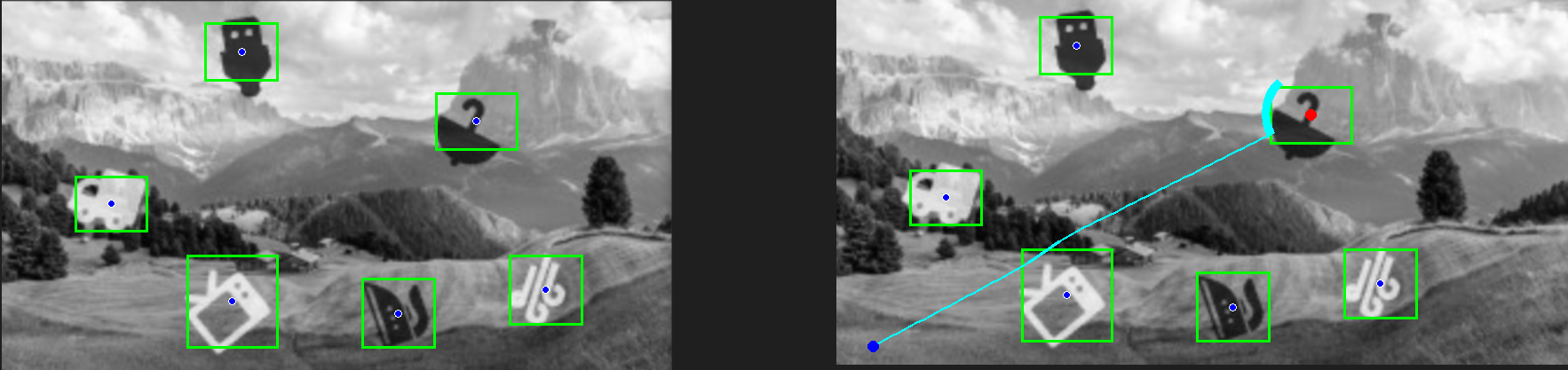 首先调用多模态大模型对输入图像进行分析,自动识别出其中所有与背景明显区分的漂浮图标,并输出每个图标的相对坐标、中心点和大小;随后将识别结果转换为像素坐标,在图像上绘制标注。接着,程序以左下角为起点、指定图标为目标点,利用人工势场法模拟小球运动,通过计算目标的吸引力和图标的排斥力,使小球在避开障碍物的同时逐步接近目标点,当到达目标区域后停止运动,最终生成带有路径轨迹的图像输出。