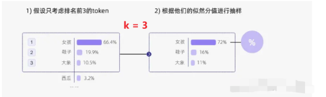 | Top-k | 在解码时,只从概率最高的前 k 个词中进行随机采样。 | 截断长尾分布中概率极低的词,防止模型“胡言乱语”。 | ![]() |