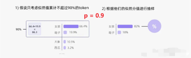 | Top-p (核采样) | 动态选择词表,直到这些词的累计概率和达到阈值 p。 | 相比 Top-k 更灵活。在模型很确定时搜索范围小,不确定时范围大。 | ![]() |
