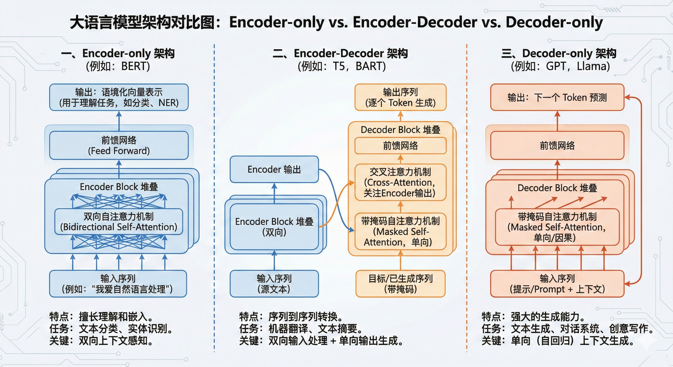 | 架构类型 | 注意力模式 | 注意力方向 | 主要应用场景 |