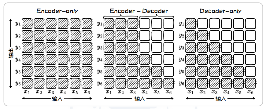 | Encoder-only | 完全(矩阵全满) | 双向 | 文本理解、情感分析 |