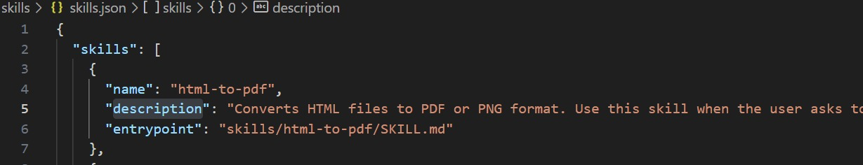 第二步:在skills.json中注册好技能名称,描述和对应SKILL.md文档