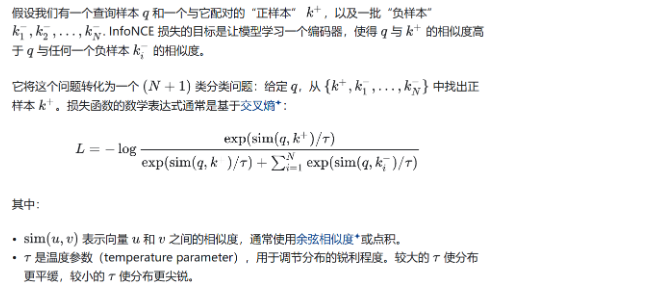 采用InfoNCE Loss:通过将正样本对的嵌入向量拉近、同时将同一batch内其他负样本对推远,来最大化正样本与负样本间的互信息,从而学习更好的语义表示