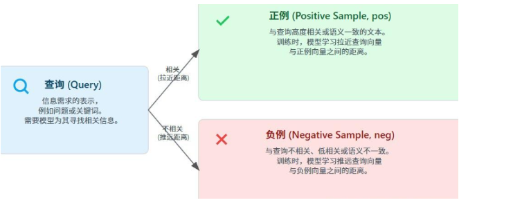 这是与给定查询(Query)不相关、相关性低或语义不一致的文本。在训练过程中,模型会学习推远查询向量与负例向量之间的距离。负样本的质量和选择策略对模型学习区分细微语义差异至关重要。