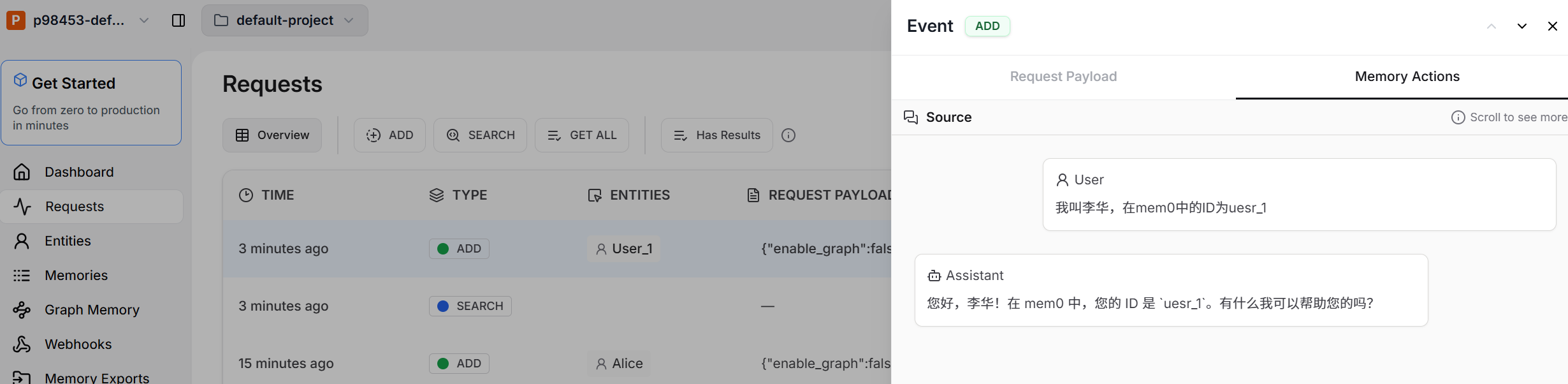 - 首先,为名为 Alice 的用户添加一些记忆。