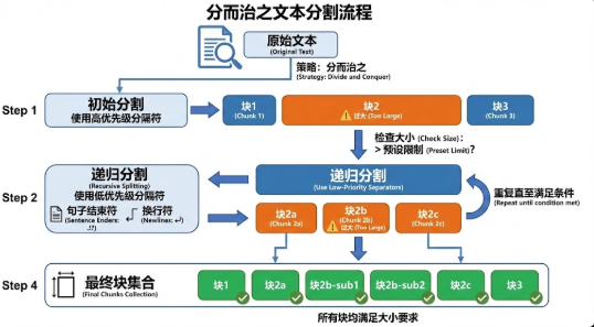 优先按段落等大语义标识切割,对超限部分逐级降维、递归细化(如换行、句点),直至全部分块达标,实现“大块优先、语义保护、按需精分。