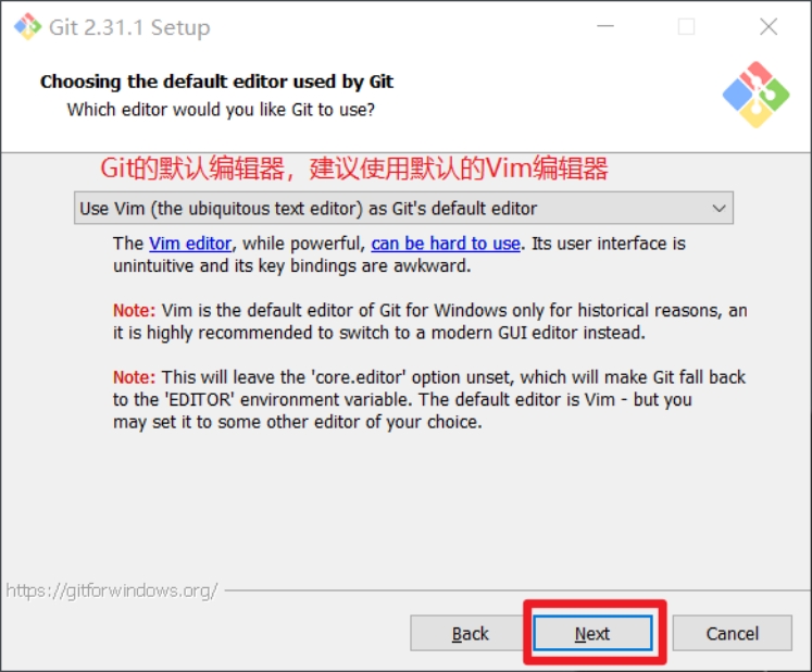 Git的默认编辑器,建议使用默认的Vim编辑器,然后点击下一步。