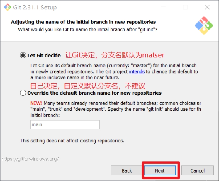 默认分支名设置,选择让Git决定,分支名默认为master,下一步。