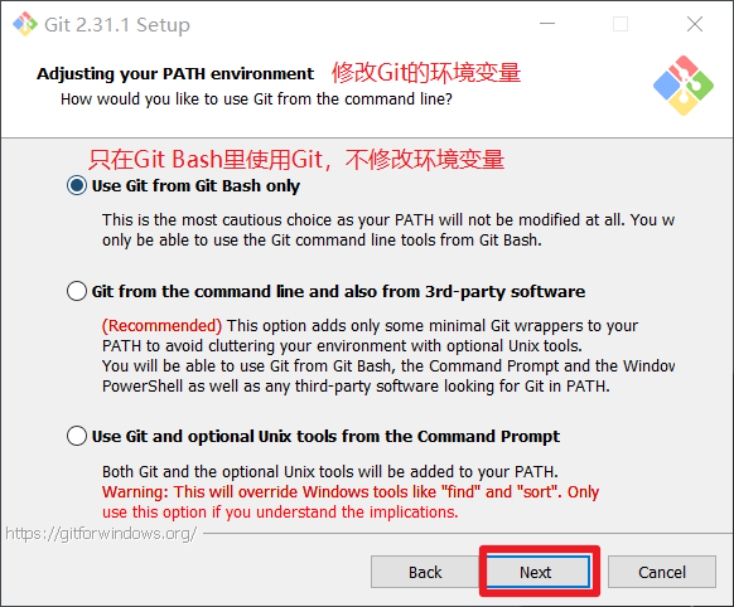 修改Git的环境变量,选第一个,不修改环境变量,只在Git Bash里使用Git。