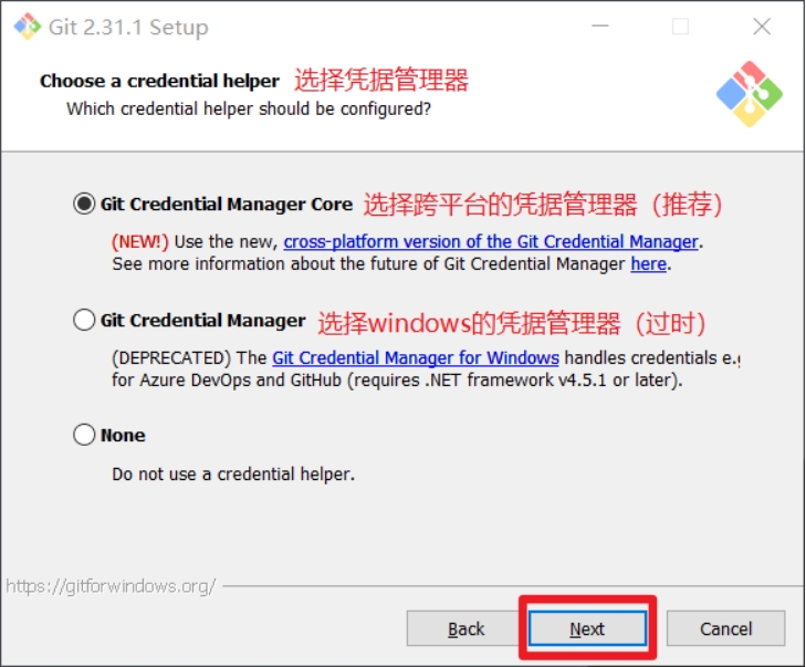 选择Git的凭据管理器,选择默认的跨平台的凭据管理器,然后下一步。