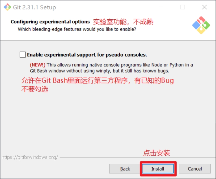 实验室功能,技术还不成熟,有已知的bug,不要勾选,然后点击右下角的Install按钮,开始安装Git。