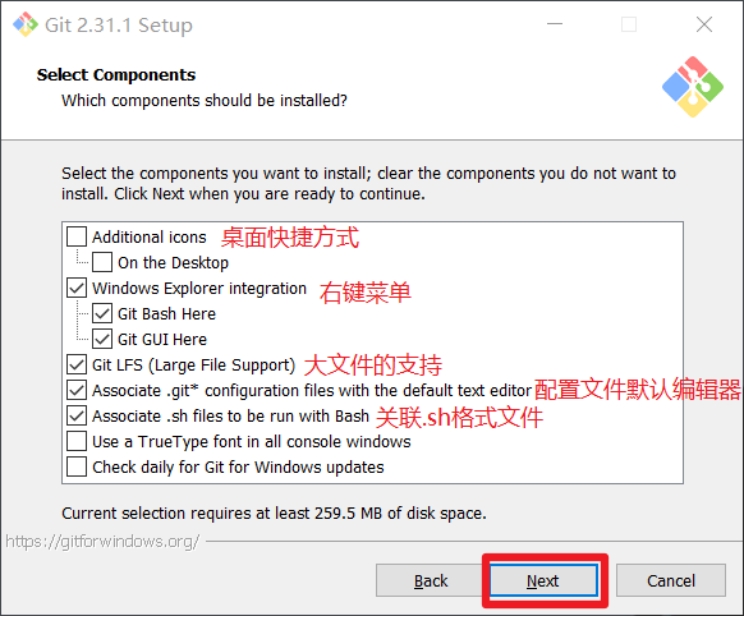 Git选项配置,推荐默认设置,然后下一步。