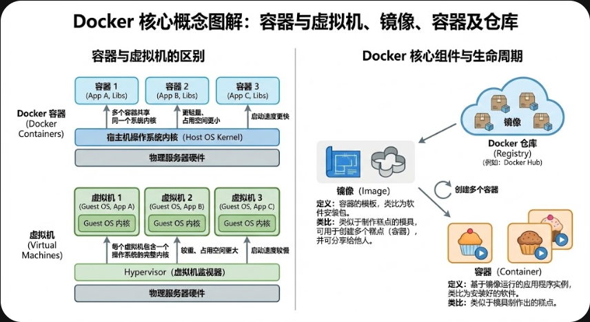 | 仓库概念 | Registry vs Repository | 用于区分“整个仓库服务”与“具体镜像库”。 | Registry (注册表): 整个存放镜像的场所 (如整个 Docker Hub 网站)。 Repository (镜像库): 存储某一个特定镜像(包含不同版本)的地方 (如 Nginx 的页面)。 | |