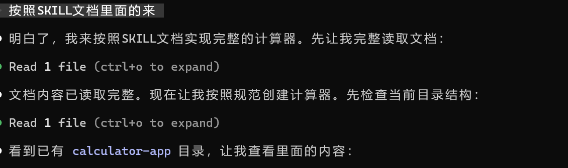 先在skill文件夹中创建一个技能包,这里是让AI生成了一个计算器UI的界面skill