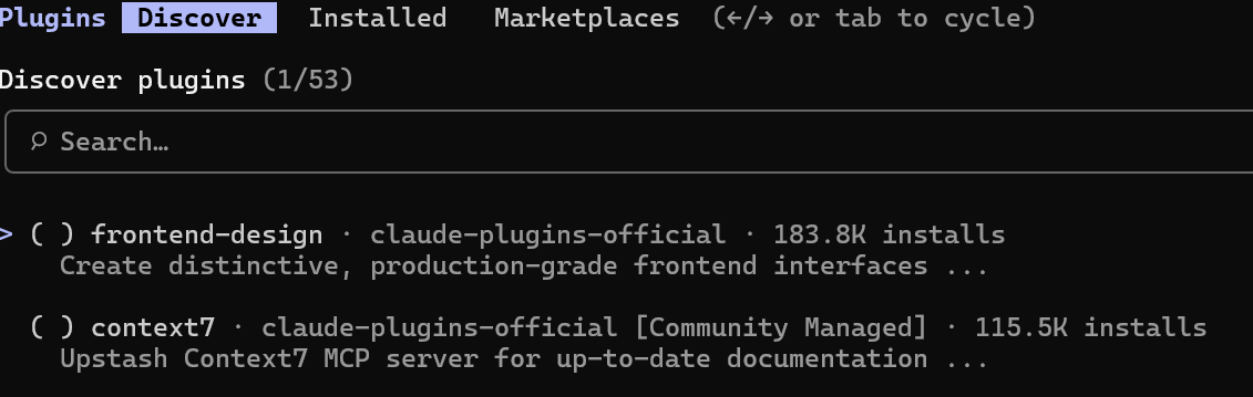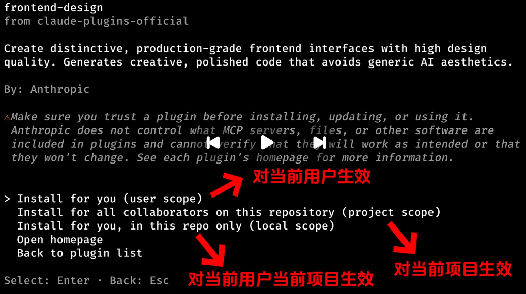 /plaugin进入插件管理器,相当于vscode的拓展,这里以frontend-design为例子,是一个前端设计的插件
